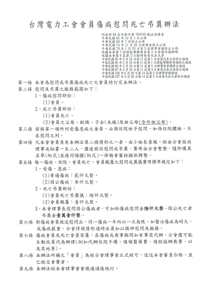 台灣電力工會會員傷病慰問死亡弔奠辦法 2016年 06月 20日 台灣電力工會 本會章程 發表留言 20260312131421下載 分享此文: 分享至 LINE(在新視窗中開啟) LINE Tweet 以電子郵件將連結傳送給朋友(在新視窗中開啟) 電子郵件 相關