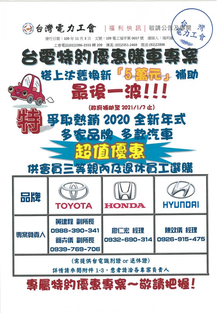 台電特約優惠購車專案 2020年 11月 4日 tplu 福利處, 福利專區, 各處專區 台電特約優惠購車專案 已關閉迴響。 分享此文: 分享到 LINE(在新視窗中開啟) LINE Tweet 按一下即可以電子郵件傳送連結給朋友(在新視窗中開啟) 電子郵件 相關