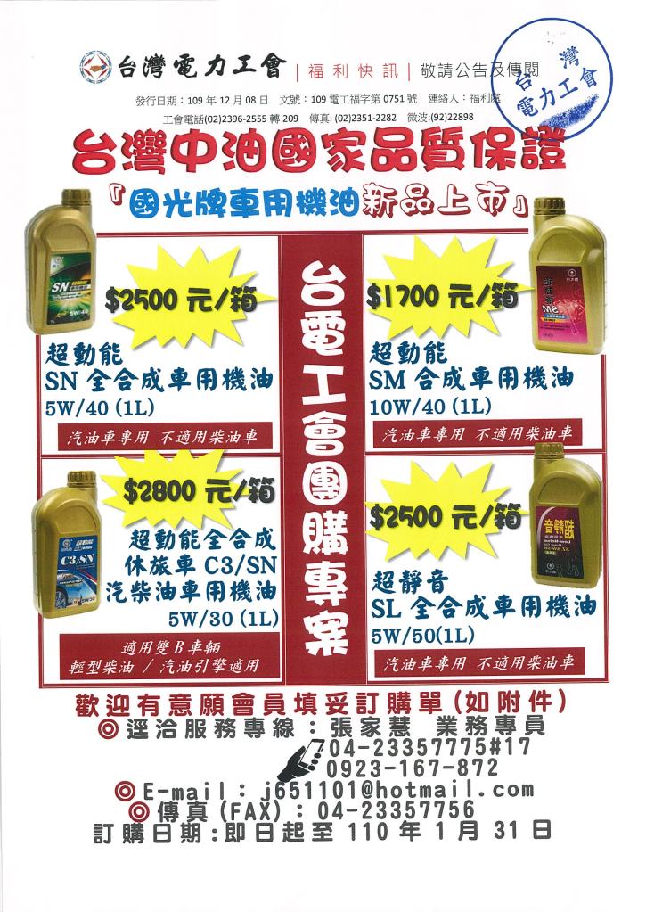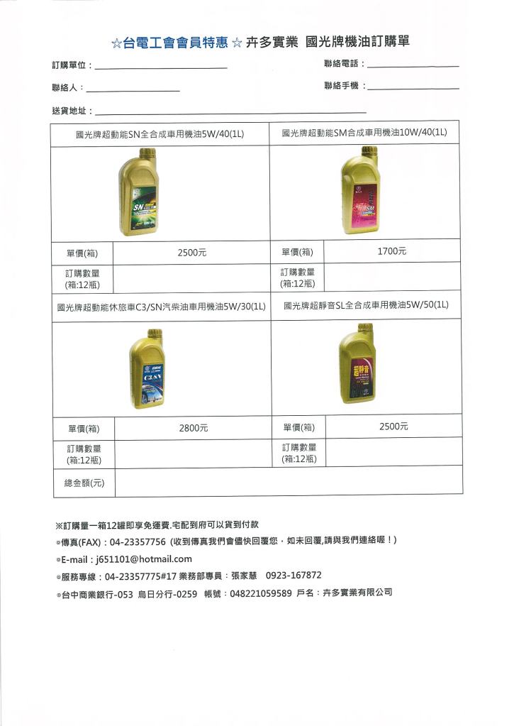 國光牌車用機油 台電工會團購專案 2020年 12月 9日 tplu 福利處, 福利專區, 各處專區 國光牌車用機油 台電工會團購專案 已關閉迴響。 109電工福字第0751號(機油)下載 分享此文: 分享到 LINE(在新視窗中開啟) LINE Tweet 按一下即可以電子郵件傳送連結給朋友(在新視窗中開啟) 電子郵件 相關