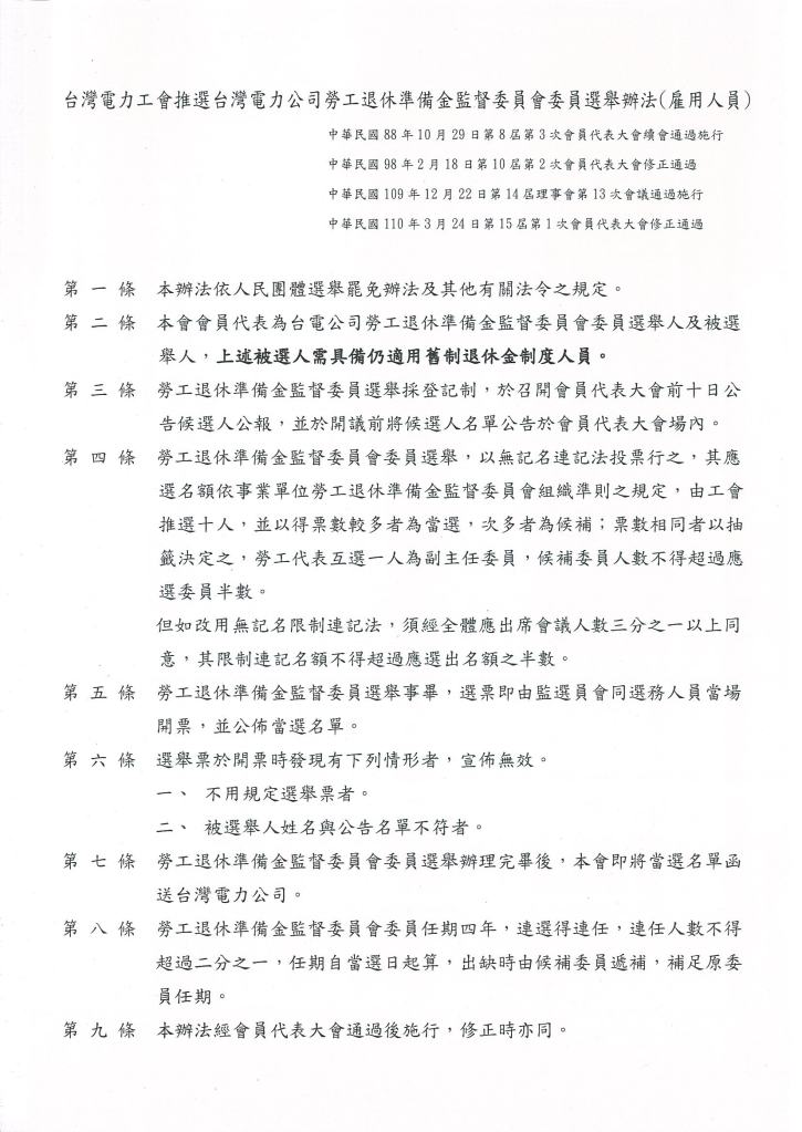 台灣電力工會推選台灣電力公司勞工退休準備金監督委員會委員選舉辦法(雇用人員) 2021年 03月 24日 台灣電力工會 本會章程 發表留言 分享此文: 分享到 LINE(在新視窗中開啟) LINE Tweet 按一下即可以電子郵件傳送連結給朋友(在新視窗中開啟) 電子郵件 相關