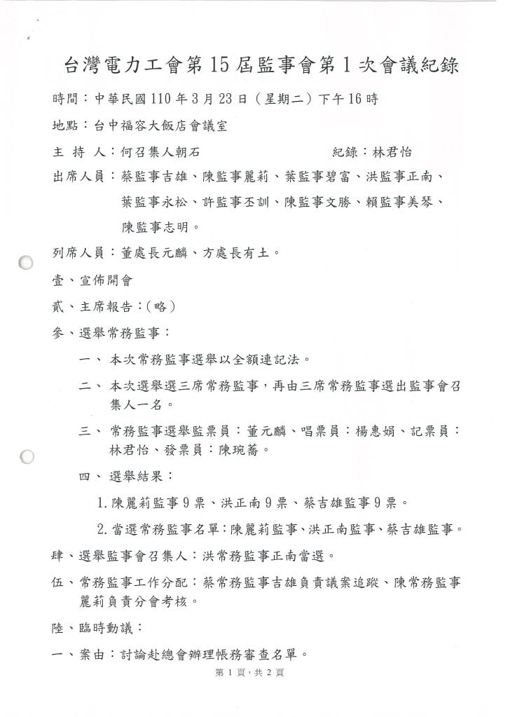 台灣電力工會第15屆監事會第1次會議紀錄 2021年 03月 31日 tplu 監事會, 會議記錄 台灣電力工會第15屆監事會第1次會議紀錄 已關閉迴響。 第15屆監事會第1次會議下載 分享此文: 分享到 LINE(在新視窗中開啟) LINE Tweet 按一下即可以電子郵件傳送連結給朋友(在新視窗中開啟) 電子郵件 相關