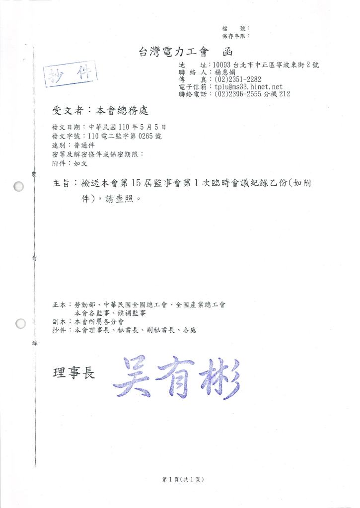 台灣電力工會第15屆監事會第1次臨時會議紀錄 2021年 04月 28日 tplu 監事會, 會議記錄 台灣電力工會第15屆監事會第1次臨時會議紀錄 已關閉迴響。 1100428第15屆監事會第1次臨時會議紀錄下載 分享此文: 分享至 LINE(在新視窗中開啟) LINE Tweet 以電子郵件將連結傳送給朋友(在新視窗中開啟) 電子郵件 相關