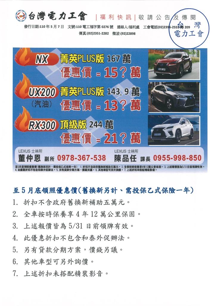 LEXUS購車優惠專案 2021年 05月 7日 tplu 福利處, 福利專區 LEXUS購車優惠專案 已關閉迴響。 LEXUS購車優惠專案下載 分享此文: 分享到 LINE(在新視窗中開啟) LINE Tweet 按一下即可以電子郵件傳送連結給朋友(在新視窗中開啟) 電子郵件 相關