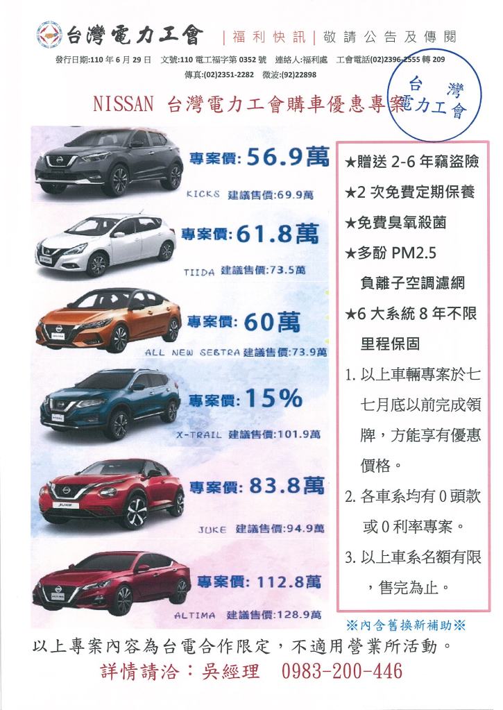 NISSAN 台電工會購車優惠專案 2021年 06月 29日 tplu 福利處, 福利專區 NISSAN 台電工會購車優惠專案 已關閉迴響。 NISSAN 台電工會購車優惠專案下載 分享此文: 分享到 LINE(在新視窗中開啟) LINE Tweet 按一下即可以電子郵件傳送連結給朋友(在新視窗中開啟) 電子郵件 相關