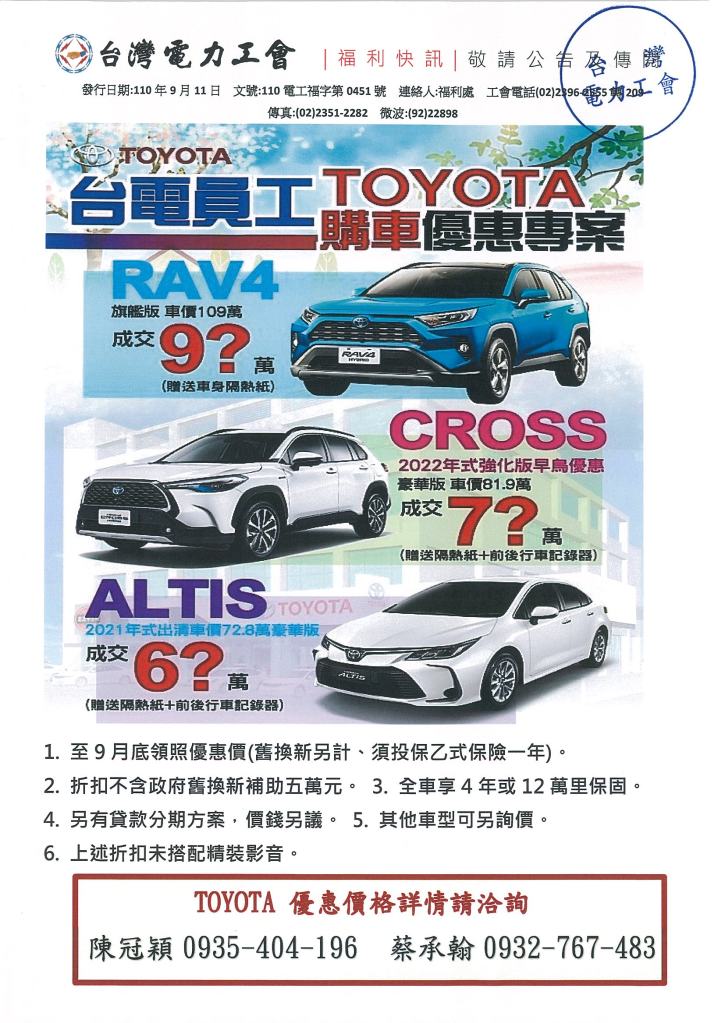 TOYOTA 台電工會購車優惠專案 2021年 09月 11日 tplu 福利處, 福利專區 TOYOTA 台電工會購車優惠專案 已關閉迴響。 TOYOTA 台電工會購車優惠專案下載 分享此文: 分享至 LINE(在新視窗中開啟) LINE Tweet 以電子郵件將連結傳送給朋友(在新視窗中開啟) 電子郵件 相關