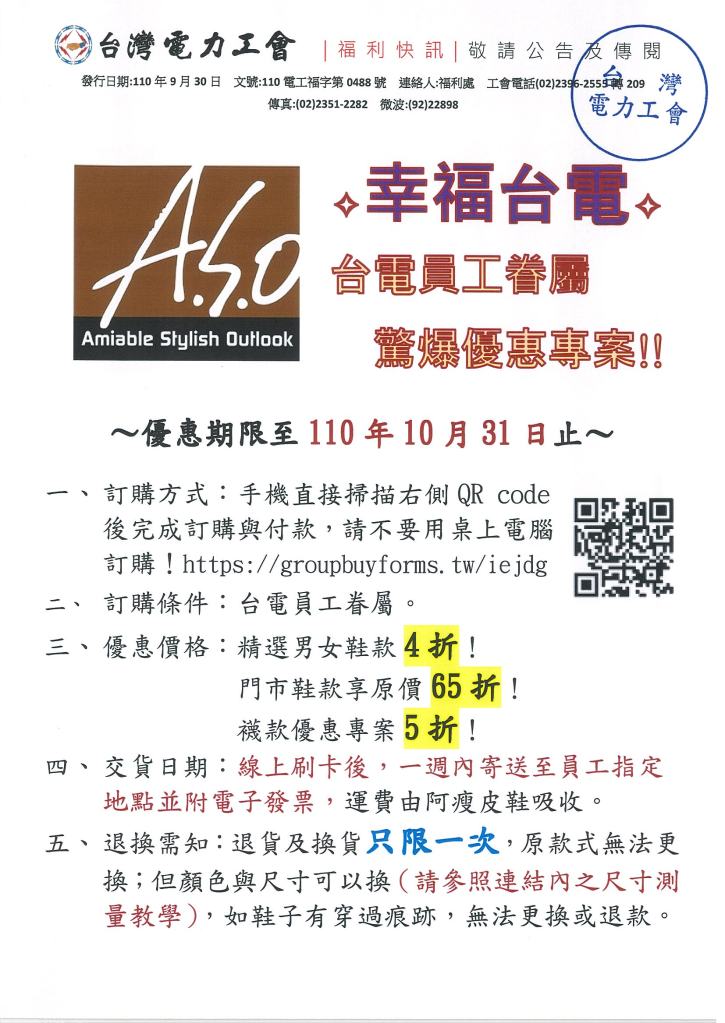 Aso阿瘦皮鞋台電員工眷屬優惠專案 2021年 09月 30日 tplu 福利處, 福利專區 Aso阿瘦皮鞋台電員工眷屬優惠專案 已關閉迴響。 Aso阿瘦皮鞋台電員工眷屬優惠專案下載 分享此文: 分享到 LINE(在新視窗中開啟) LINE Tweet 按一下即可以電子郵件傳送連結給朋友(在新視窗中開啟) 電子郵件 相關