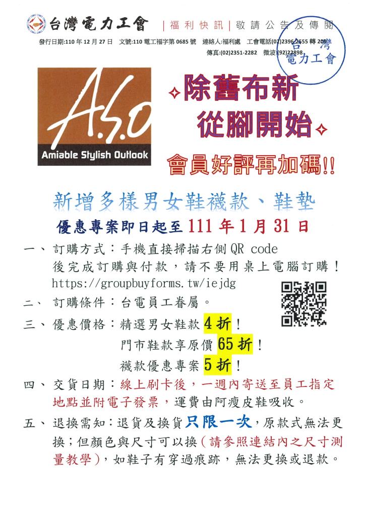 ASO阿瘦皮鞋台電員工眷屬優惠專案 2021年 12月 27日 tplu 福利處, 福利專區 ASO阿瘦皮鞋台電員工眷屬優惠專案 已關閉迴響。 ASO阿瘦皮鞋台電員工眷屬優惠專案下載 分享此文: 分享到 LINE(在新視窗中開啟) LINE Tweet 按一下即可以電子郵件傳送連結給朋友(在新視窗中開啟) 電子郵件 相關