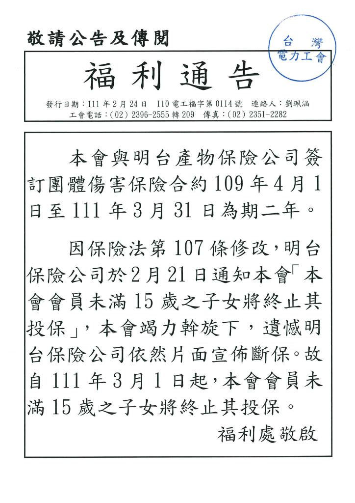 明台產物保險終止投保本會會員未滿15歲之子女通告 2022年 02月 25日 tplu 福利處, 福利專區 明台產物保險終止投保本會會員未滿15歲之子女通告 已關閉迴響。 明台產物保險終止投保本會會員未滿15歲之子女通告下載 分享此文: 分享到 LINE(在新視窗中開啟) LINE Tweet 按一下即可以電子郵件傳送連結給朋友(在新視窗中開啟) 電子郵件 相關