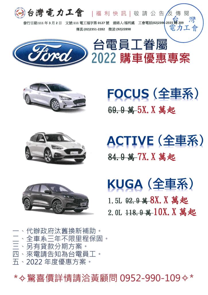 FORD 台電員工3月購車優惠專案 2022年 03月 2日 tplu 福利處, 福利專區 FORD 台電員工3月購車優惠專案 已關閉迴響。 2022年FORD台電購車優惠方案下載 分享此文: 分享到 LINE(在新視窗中開啟) LINE Tweet 按一下即可以電子郵件傳送連結給朋友(在新視窗中開啟) 電子郵件 相關
