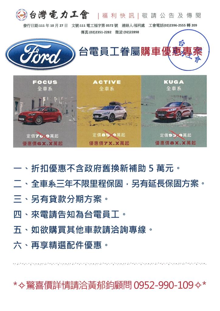 FORD 台電員工10月購車優惠專案 2022年 10月 28日 tplu 福利處, 福利專區 FORD 台電員工10月購車優惠專案 已關閉迴響。 FORD 台電員工10月購車優惠專案下載 分享此文: 分享到 LINE(在新視窗中開啟) LINE Tweet 按一下即可以電子郵件傳送連結給朋友(在新視窗中開啟) 電子郵件 相關