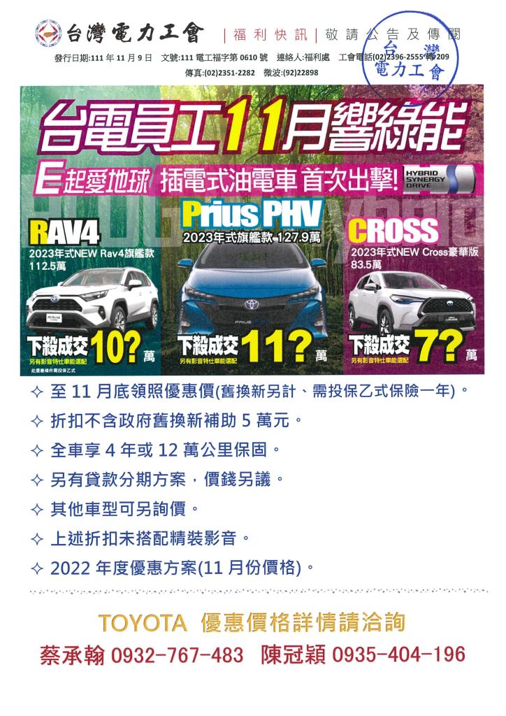 TOYOTA 台電員工11月購車優惠專案 2022年 11月 9日 tplu 福利處, 福利專區 TOYOTA 台電員工11月購車優惠專案 已關閉迴響。 TOYOTA 台電員工11月購車優惠專案下載 分享此文: 分享到 LINE(在新視窗中開啟) LINE Tweet 按一下即可以電子郵件傳送連結給朋友(在新視窗中開啟) 電子郵件 相關