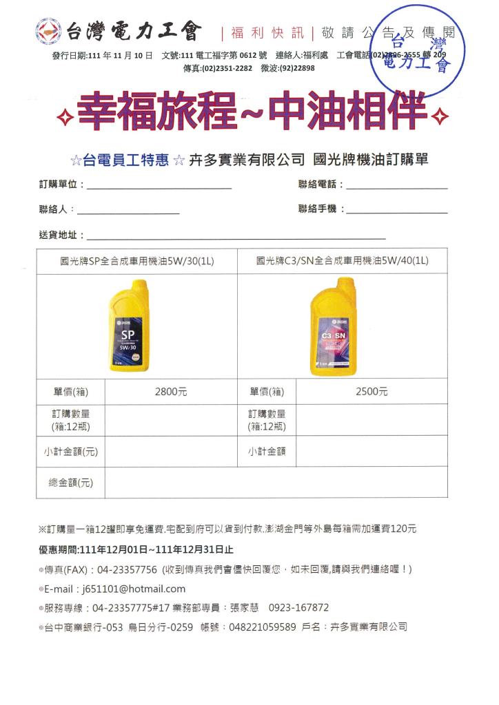 中油國光牌機油優惠專案 2022年 11月 10日 tplu 福利處, 福利專區 中油國光牌機油優惠專案 已關閉迴響。 中油國光牌機油優惠專案下載 分享此文: 分享至 LINE(在新視窗中開啟) LINE Tweet 以電子郵件將連結傳送給朋友(在新視窗中開啟) 電子郵件 相關