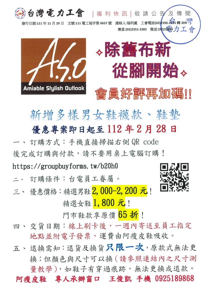 ASO阿瘦皮鞋台電員工眷屬優惠專案 2022年 11月 30日 tplu 福利處, 福利專區 ASO阿瘦皮鞋台電員工眷屬優惠專案 已關閉迴響。 ASO阿瘦皮鞋台電員工眷屬優惠專案下載 分享此文: 分享至 LINE(在新視窗中開啟) LINE Tweet 以電子郵件將連結傳送給朋友(在新視窗中開啟) 電子郵件 相關