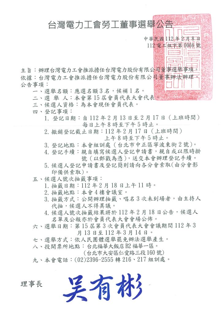 台灣電力工會勞工董事選舉公告及相關資料 2023年 02月 8日 tplu 選舉專區 台灣電力工會勞工董事選舉公告及相關資料 已關閉迴響。 分享此文: 分享到 LINE(在新視窗中開啟) LINE Tweet 按一下即可以電子郵件傳送連結給朋友(在新視窗中開啟) 電子郵件 相關