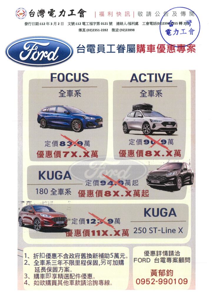 FORD 台電員工3月購車優惠專案 2023年 03月 2日 tplu 福利處, 福利專區 FORD 台電員工3月購車優惠專案 已關閉迴響。 FORD 台電員工3月購車優惠專案a下載 分享此文: 分享至 LINE(在新視窗中開啟) LINE Tweet 以電子郵件將連結傳送給朋友(在新視窗中開啟) 電子郵件 相關