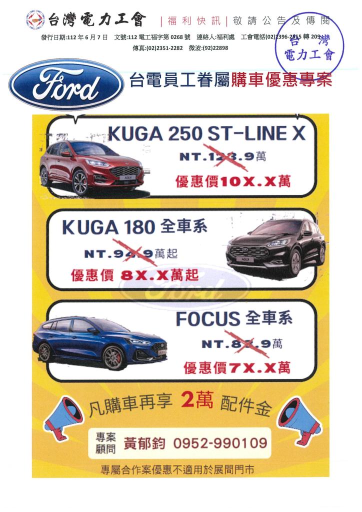 FORD 台電員工6月購車優惠專案 2023年 06月 8日 tplu 福利處, 福利專區 FORD 台電員工6月購車優惠專案 已關閉迴響。 FORD 台電員工6月購車優惠專案下載 分享此文: 分享至 LINE(在新視窗中開啟) LINE Tweet 以電子郵件將連結傳送給朋友(在新視窗中開啟) 電子郵件 相關