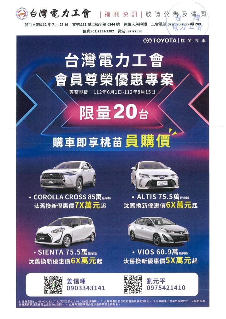 TOYOTA 台電員工7-8月購車優惠專案 2023年 07月 27日 tplu 福利處, 福利專區 TOYOTA 台電員工7-8月購車優惠專案 已關閉迴響。 TOYOTA 台電員工7-8月購車優惠專案下載 分享此文: 分享到 LINE(在新視窗中開啟) LINE Tweet 按一下即可以電子郵件傳送連結給朋友(在新視窗中開啟) 電子郵件 相關