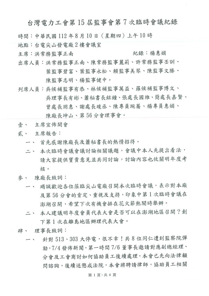 台灣電力工會第15屆監事會第7次臨時會議紀錄 2023年 08月 21日 tplu 監事會 台灣電力工會第15屆監事會第7次臨時會議紀錄 已關閉迴響。 分享此文: 分享到 LINE(在新視窗中開啟) LINE Tweet 按一下即可以電子郵件傳送連結給朋友(在新視窗中開啟) 電子郵件 相關