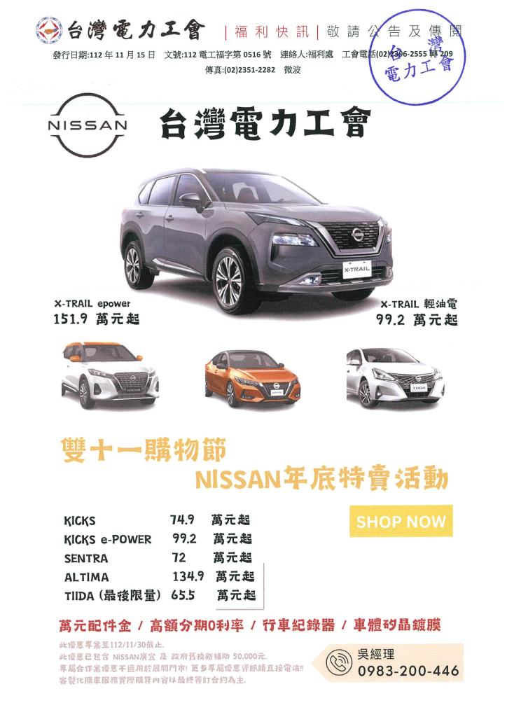 NISSAN 台電員工11月購車優惠專案 2023年 11月 15日 tplu 福利處, 福利專區 NISSAN 台電員工11月購車優惠專案 已關閉迴響。 NISSAN 台電員工11月購車優惠專案下載 分享此文: 分享到 LINE(在新視窗中開啟) LINE Tweet 按一下即可以電子郵件傳送連結給朋友(在新視窗中開啟) 電子郵件 相關