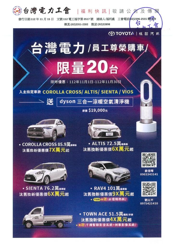 TOYOTA 台電員工購車優惠專案 2023年 11月 15日 tplu 福利處, 福利專區 TOYOTA 台電員工購車優惠專案 已關閉迴響。 TOYOTA 台電員工購車優惠專案下載 分享此文: 分享至 LINE(在新視窗中開啟) LINE Tweet 以電子郵件將連結傳送給朋友(在新視窗中開啟) 電子郵件 相關