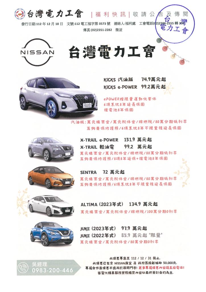 NISSAN 台電員工12月購車優惠專案 2023年 12月 18日 tplu 福利處, 福利專區 NISSAN 台電員工12月購車優惠專案 已關閉迴響。 NISSAN 台電員工12月購車優惠專案下載 分享此文: 分享至 LINE(在新視窗中開啟) LINE Tweet 以電子郵件將連結傳送給朋友(在新視窗中開啟) 電子郵件 相關