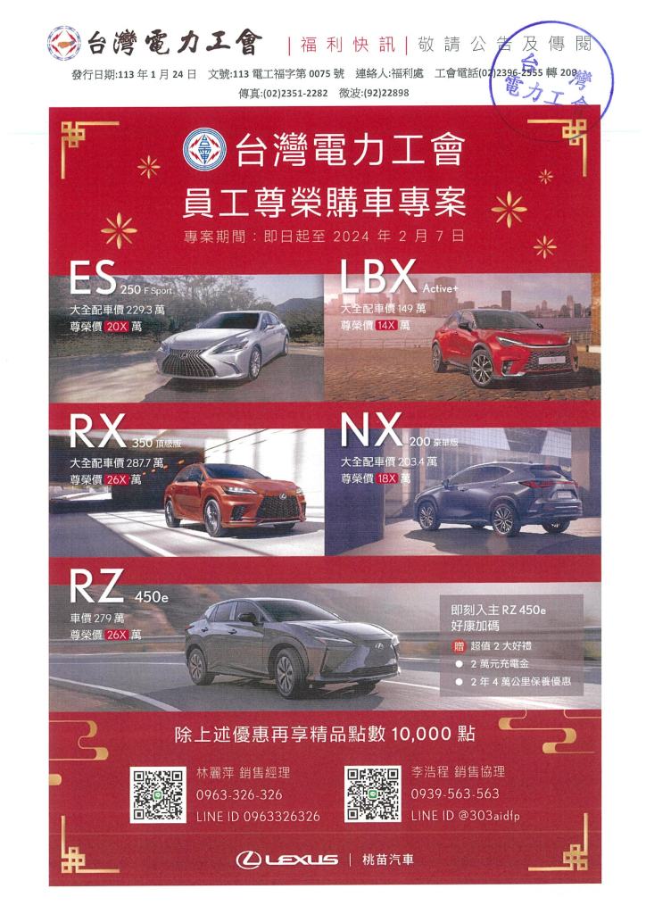 LEXUS 台電員工1-2月購車優惠專案 2024年 01月 24日 tplu 福利處, 福利專區 LEXUS 台電員工1-2月購車優惠專案 已關閉迴響。 LEXUS 台電員工1-2月購車優惠專案下載 分享此文: 分享至 LINE(在新視窗中開啟) LINE Tweet 以電子郵件將連結傳送給朋友(在新視窗中開啟) 電子郵件 相關