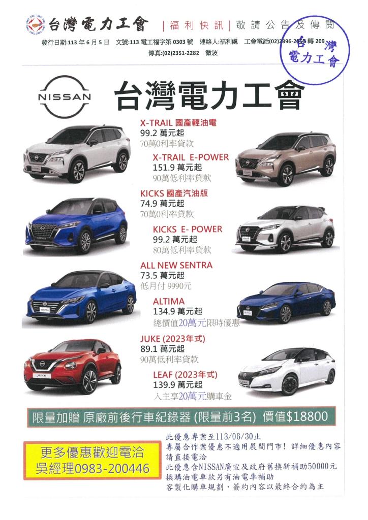 NISSAN 台電員工6月購車優惠專案 2024年 06月 5日 tplu 福利處, 福利專區 NISSAN 台電員工6月購車優惠專案 已關閉迴響。 NISSAN 台電員工6月購車優惠專案下載 分享此文: 分享至 LINE(在新視窗中開啟) LINE Tweet 以電子郵件將連結傳送給朋友(在新視窗中開啟) 電子郵件 相關