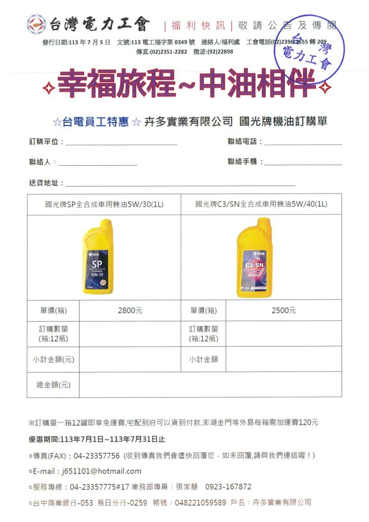 中油國光牌機油優惠專案 2024年 07月 5日 tplu 福利處, 福利專區 中油國光牌機油優惠專案 已關閉迴響。 中油國光牌機油優惠專案下載 分享此文: 分享到 LINE(在新視窗中開啟) LINE Tweet 按一下即可以電子郵件傳送連結給朋友(在新視窗中開啟) 電子郵件 相關