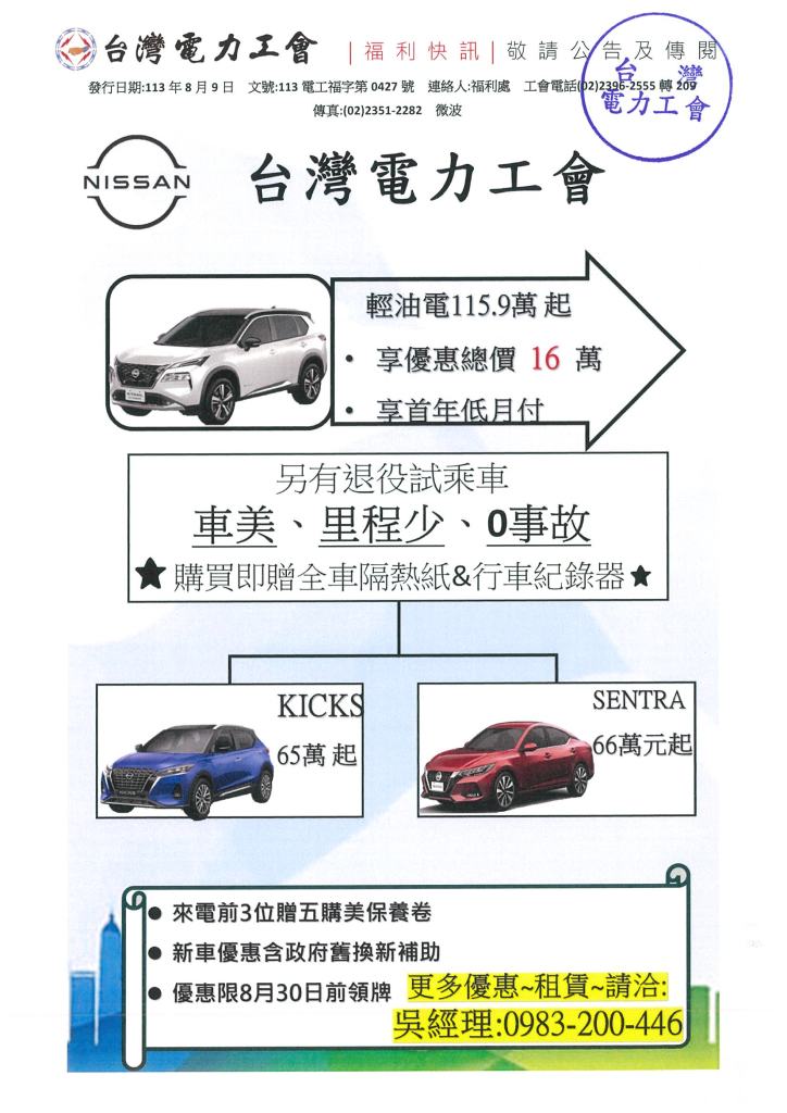 NISSAN 台電員工8月購車優惠專案 2024年 08月 12日 tplu 福利處, 福利專區 NISSAN 台電員工8月購車優惠專案 已關閉迴響。 NISSAN 台電員工8月購車優惠專案下載 分享此文: 分享至 LINE(在新視窗中開啟) LINE Tweet 以電子郵件將連結傳送給朋友(在新視窗中開啟) 電子郵件 相關