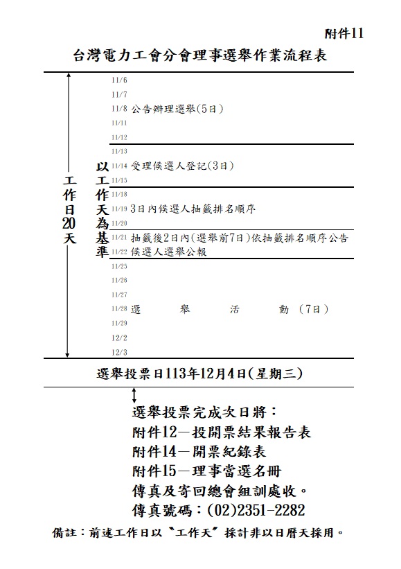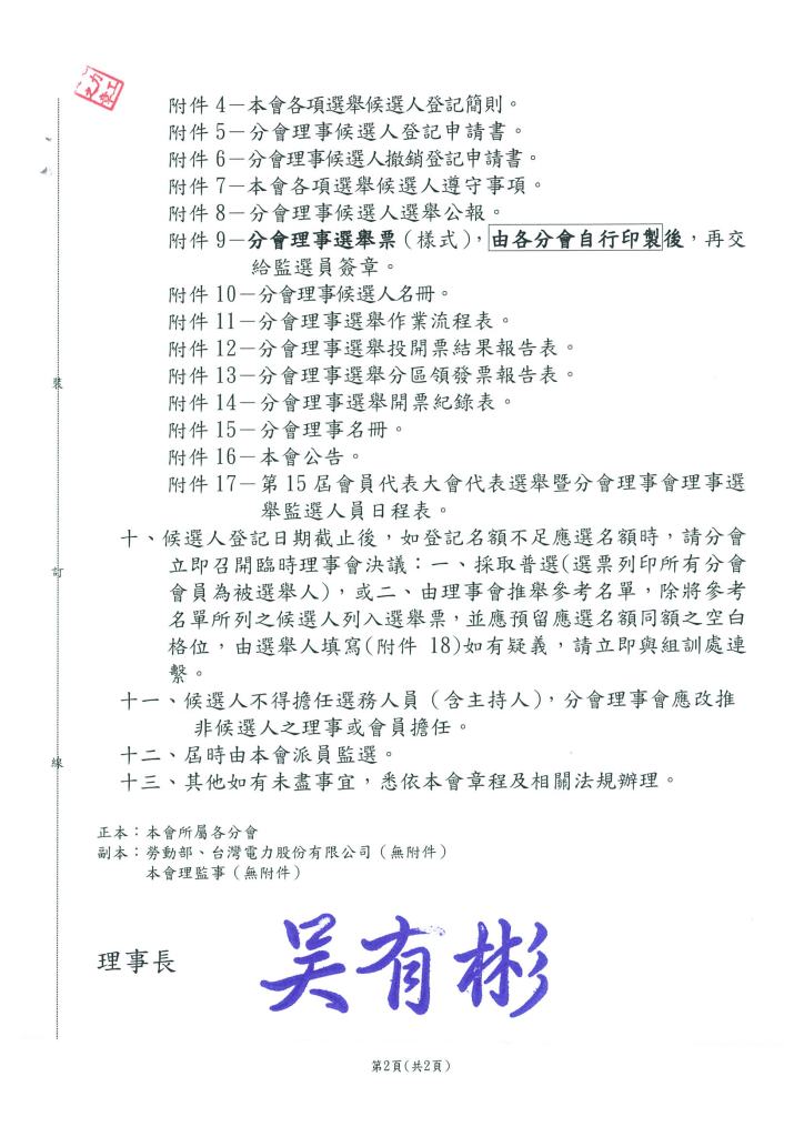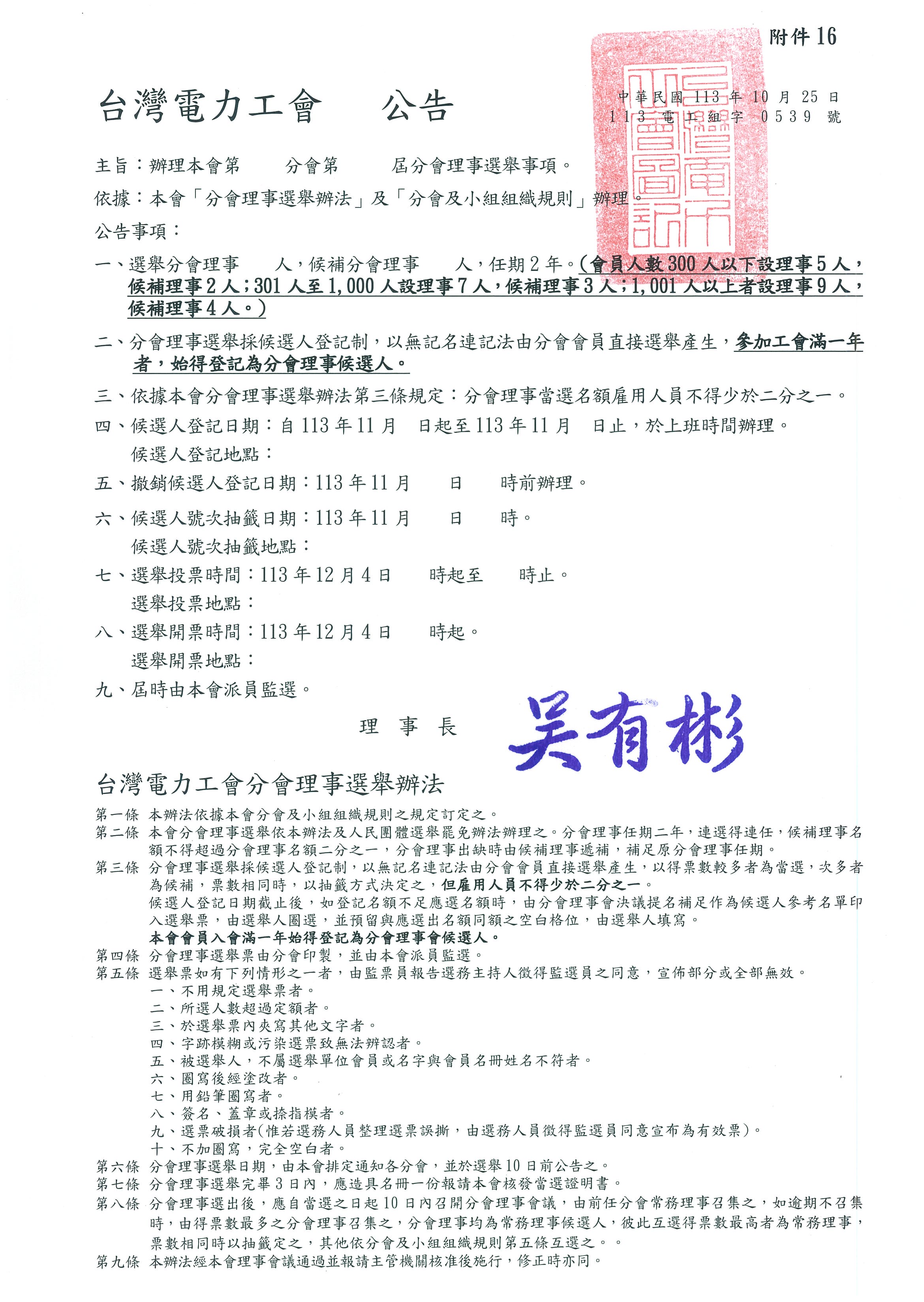 本會所屬各分會分會理事選舉(113年12月4日)相關資料,請各分會協助辦理選務工作 2024年 10月 28日 tplu 選舉專區, 分會理事會選舉專區 本會所屬各分會分會理事選舉(113年12月4日)相關資料,請各分會協助辦理選務工作 已關閉迴響。 附件1_分會理事選舉辦法下載 附件2_分會及小組組織規則下載 附件3_分會理事應選名額統計表下載 附件4_各項選舉候選人登記簡則下載 附件5_分會理事候選人登記申請書下載 附件6_分會理事候選人撤銷登記申請書下載 附件7_各項選舉候選人遵守事項下載 附件8_分會理事候選人選舉公報(A3)下載 附件9_分會理事選舉票(檥式)-由各分會自行印製下載 附件10_分會理事選舉候選人名冊下載 附件11_理事選舉作業流程表下載 附件12_分會理事選舉投開票報告表下載 附件13_分會理事選舉分區領發票報告表下載 附件14_分會理事選舉開票結果紀錄表下載 附件15_台灣電力工會分會理事名冊(空白格式)下載 附件16_分會理事選舉公告下載 附件17_選舉監選人員日程表下載 分享此文: 分享至 LINE(在新視窗中開啟) LINE Tweet 以電子郵件將連結傳送給朋友(在新視窗中開啟) 電子郵件 相關