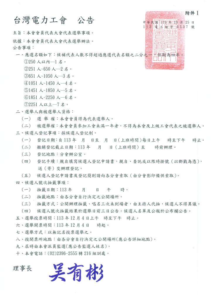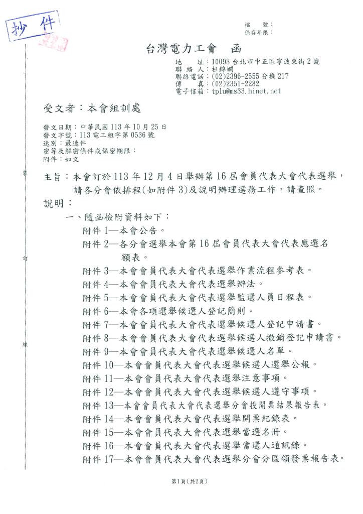 本會會員代表選舉(113年12月4日)相關資料,請各分會協助辦理選務工作 2024年 10月 28日 tplu 選舉專區 本會會員代表選舉(113年12月4日)相關資料,請各分會協助辦理選務工作 已關閉迴響。 附件2_分會選舉會員代表應選名額表下載 附件3_會員代表選舉作業流程表下載 附件4_會員代表選舉辦法下載 附件5_選舉監選人員日程表下載 附件6_各項選舉候選人登記簡則下載 附件7_台灣電力工會會員代表大會代表選舉候選人登記申請書下載 附件8_台灣電力工會會員代表大會代表選舉候選人撤銷登記申請書下載 附件9_台灣電力工會會員代表選舉候選人名單下載 附件10_台灣電力工會會員代表大會代表選舉候選人選舉公報下載 附件11_會員代表選舉注意事項下載 附件12_會員代表選舉候選人遵守事項下載 附件13_台灣電力工會會員代表大會代表選舉分會投開票結果報告表下載 附件14_台灣電力工會會員代表大會候選人開票紀錄表下載 附件15_台灣電力工會會員代表當選名冊下載 附件16_台灣電力工會會員代表大會代表通訊錄下載 附件17_台灣電力工會會員代表大會代表選舉分區領發票報告表下載 分享此文: 分享至 LINE(在新視窗中開啟) LINE Tweet 以電子郵件將連結傳送給朋友(在新視窗中開啟) 電子郵件 相關