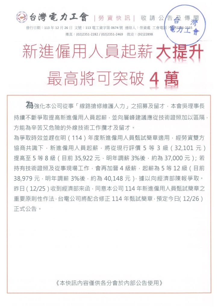 新進僱用人員起薪大提升 最高將可突破4萬 2024年 12月 26日 tplu 勞資處, 工會快訊, 最新消息 新進僱用人員起薪大提升 最高將可突破4萬 已關閉迴響。 分享此文: 分享至 LINE(在新視窗中開啟) LINE Tweet 以電子郵件將連結傳送給朋友(在新視窗中開啟) 電子郵件 相關