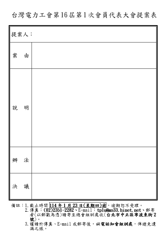 第16屆第1次會員代表大會提案表 2025年 01月 10日 tplu 組訓處 第16屆第1次會員代表大會提案表 已關閉迴響。 第16屆第1次會員代表大會提案表下載 分享此文: 分享至 LINE(在新視窗中開啟) LINE Tweet 以電子郵件將連結傳送給朋友(在新視窗中開啟) 電子郵件 相關