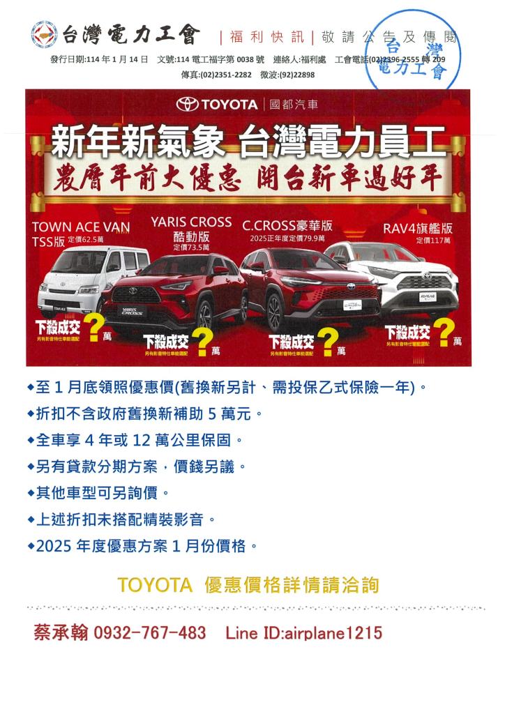 TOYOTA 台電員工購車優惠專案 2025年 01月 14日 tplu 福利處, 福利專區 TOYOTA 台電員工購車優惠專案 已關閉迴響。 TOYOTA 台電員工購車優惠專案下載 分享此文: 分享至 LINE(在新視窗中開啟) LINE Tweet 以電子郵件將連結傳送給朋友(在新視窗中開啟) 電子郵件 相關