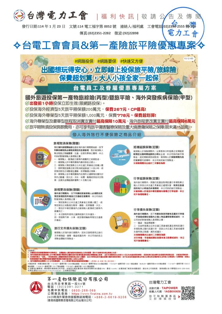 第一產險旅平險優惠專案 2025年 01月 23日 tplu 福利處, 福利專區 第一產險旅平險優惠專案 已關閉迴響。 第一產險旅平險優惠專案下載 台電旅平險DM下載 台電旅平險投保操作手冊_下載 台電旅平險活動廣告下載 分享此文: 分享到 LINE(在新視窗中開啟) LINE Tweet 按一下即可以電子郵件傳送連結給朋友(在新視窗中開啟) 電子郵件 相關