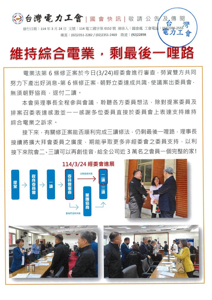 維持綜合電業 剩最後一哩路 2025年 03月 24日 tplu 國會處, 工會快訊, 最新消息 維持綜合電業 剩最後一哩路 已關閉迴響。 分享此文: 分享至 LINE(在新視窗中開啟) LINE Tweet 以電子郵件將連結傳送給朋友(在新視窗中開啟) 電子郵件 相關
