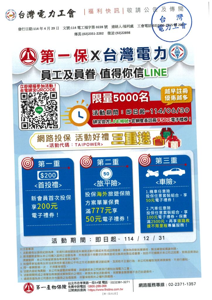 第一產險 快訊 2025年 04月 30日 tplu 福利處, 福利專區 第一產險 快訊 已關閉迴響。 114電工福字第0228號(第一產險 快訊)下載 114年台電「LINE好友募集中!_綁定送限量好禮」活動至0630下載 114年台電「新客專享!首次投保享好禮」活動 (1)下載 114年台電「網路投保車險享好禮」活動 (1)下載 114年台電「網路投保旅平險滿額享好禮」活動(不限額)下載 LINE特色_11404版(台電) (1)下載 LINE綁定步驟_11404版(台電)下載 分享此文: 分享至 LINE(在新視窗中開啟) LINE Tweet Email a link to a friend(在新視窗中開啟) 電子郵件 相關