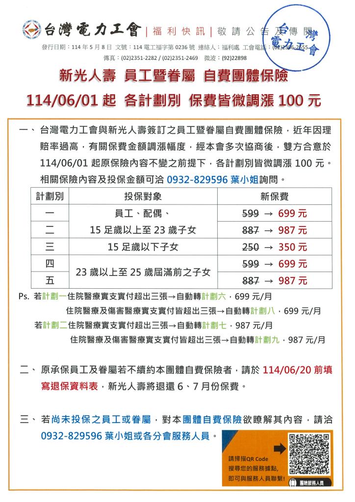 本會與新光保險公司續簽團體傷害險,於114.6.1起實施新光保險續約 快訊 2025年 05月 8日 tplu 福利處, 福利專區 本會與新光保險公司續簽團體傷害險,於114.6.1起實施新光保險續約 快訊 已關閉迴響。 本會與新光保險公司續簽團體傷害險,於114.6.1起實施新光保險續約 快訊下載 分享此文: 分享至 LINE(在新視窗中開啟) LINE Tweet Email a link to a friend(在新視窗中開啟) 電子郵件 相關