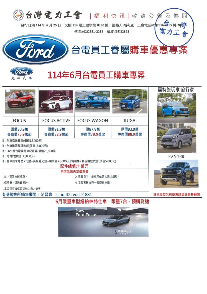 FORD 台電員工購車優惠專案 2025年 06月 25日 tplu 福利處, 福利專區 FORD 台電員工購車優惠專案 已關閉迴響。 114電工福字第0330號(FORD 快訊)下載 分享此文: 分享至 LINE(在新視窗中開啟) LINE Tweet Email a link to a friend(在新視窗中開啟) 電子郵件 相關