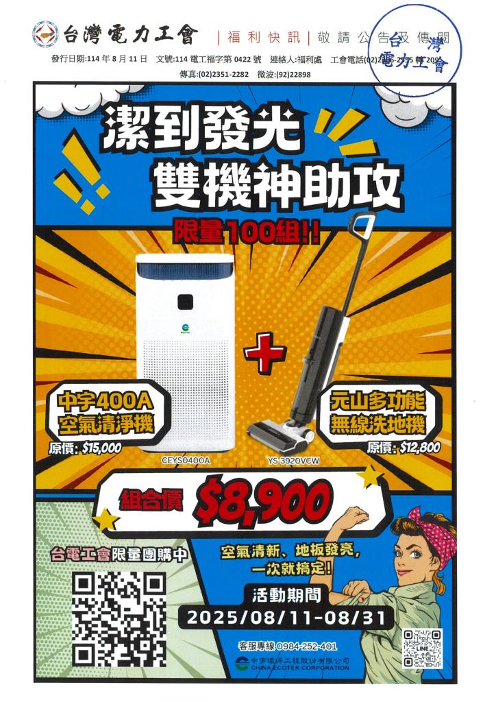 中宇GO空氣清淨機+元山多功能洗地機優惠專案 2025年 08月 12日 tplu 福利處, 福利專區 中宇GO空氣清淨機+元山多功能洗地機優惠專案 已關閉迴響。 114電工福字第0422號(中宇GO空氣清淨機+元山多功能洗地機 快訊)下載 分享此文: 分享到 LINE(在新視窗中開啟) LINE Tweet 按一下即可以電子郵件傳送連結給朋友(在新視窗中開啟) 電子郵件 相關