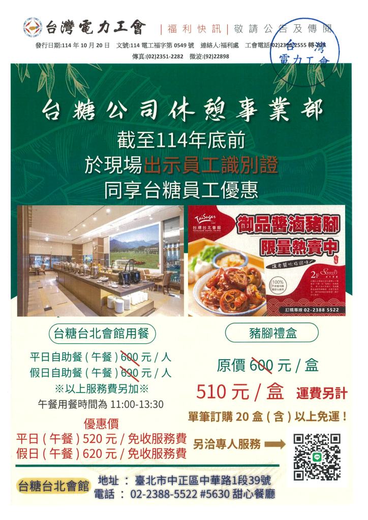 台糖台北會館及豬腳禮盒優惠 2025年 10月 21日 tplu 福利處, 福利專區 台糖台北會館及豬腳禮盒優惠 已關閉迴響。 114電工福字第0549號(台糖休憩事業部用餐與豬腳禮盒 快訊)下載 分享此文: 分享至 LINE(在新視窗中開啟) LINE Tweet Email a link to a friend(在新視窗中開啟) 電子郵件 相關
