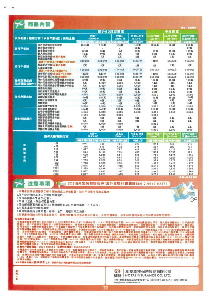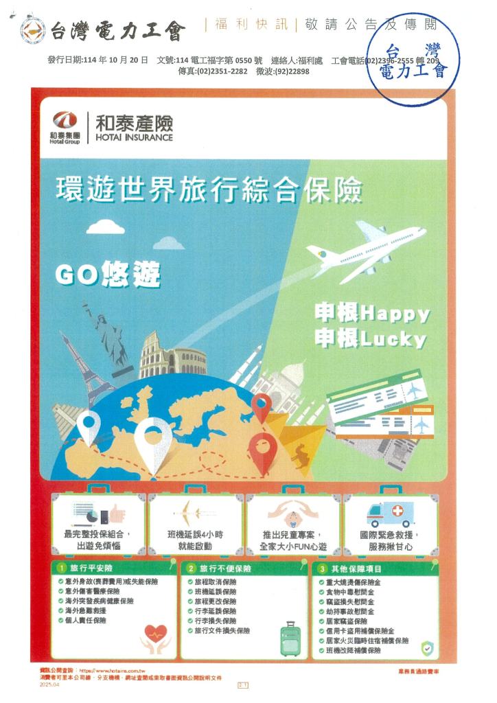 和泰環遊世界旅行綜合保險 2025年 10月 21日 tplu 福利處, 福利專區 和泰環遊世界旅行綜合保險 已關閉迴響。 114電工福字第0550號(和泰旅綜險 快訊)下載 和泰產險-環遊世界旅行綜合保險商品文宣下載 分享此文: 分享至 LINE(在新視窗中開啟) LINE Tweet Email a link to a friend(在新視窗中開啟) 電子郵件 相關