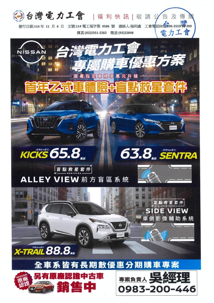 NISSAN 台電員工專屬購車優惠專案 2025年 11月 6日 tplu 福利處, 福利專區 NISSAN 台電員工專屬購車優惠專案 已關閉迴響。 1141106福利快訊-NISSAN購車優惠下載 分享此文: 分享到 LINE(在新視窗中開啟) LINE Tweet 按一下即可以電子郵件傳送連結給朋友(在新視窗中開啟) 電子郵件 相關