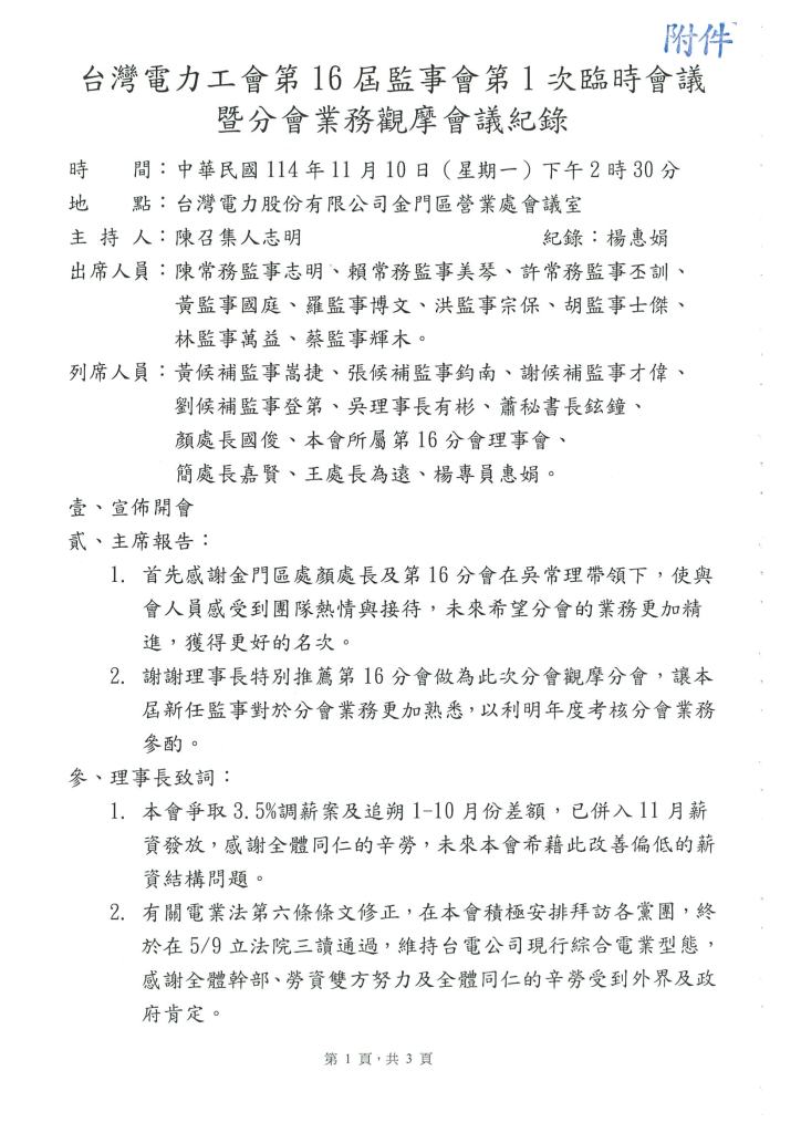 台灣電力工會第16屆監事會第1次臨時會議暨分會業務觀摩會議紀錄 2025年 12月 1日 tplu 監事會, 會議記錄 台灣電力工會第16屆監事會第1次臨時會議暨分會業務觀摩會議紀錄 已關閉迴響。 分享此文: 分享至 LINE(在新視窗中開啟) LINE Tweet 以電子郵件將連結傳送給朋友(在新視窗中開啟) 電子郵件 相關