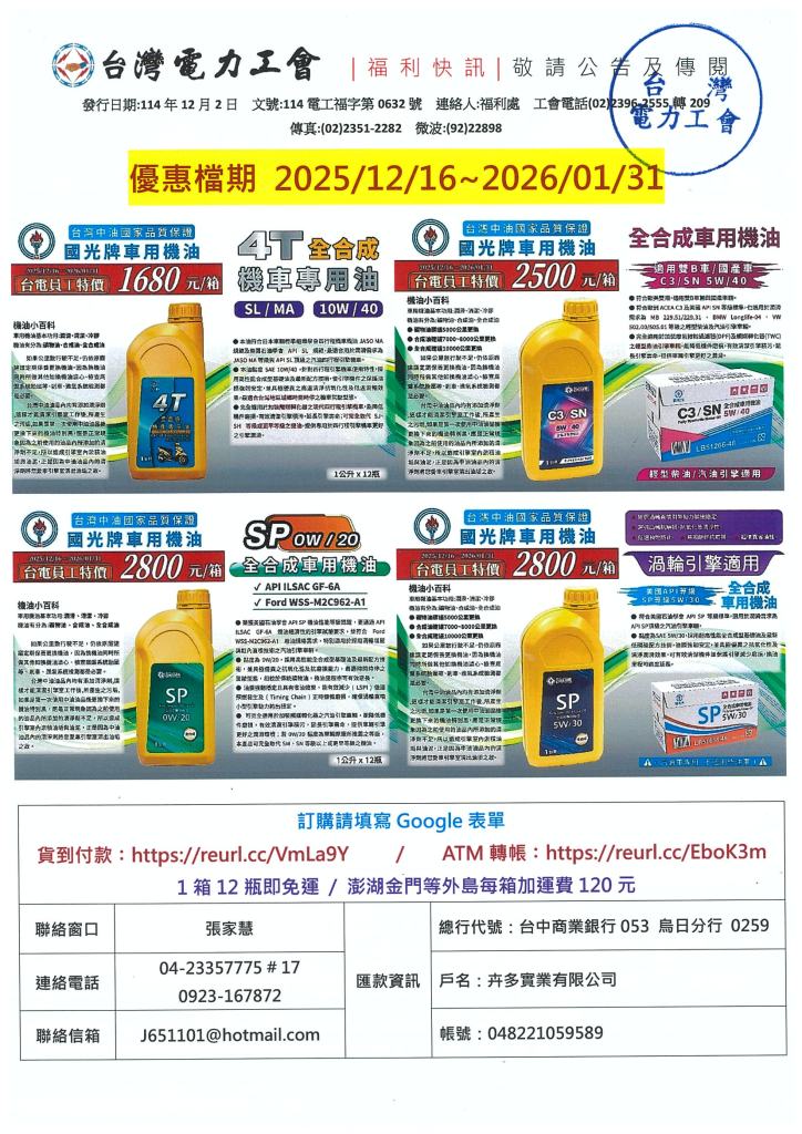 中油國光牌機油優惠專案 2025年 12月 2日 tplu 福利處, 福利專區 中油國光牌機油優惠專案 已關閉迴響。 1141202福利快訊-中油國光牌機油優惠下載 分享此文: 分享到 LINE(在新視窗中開啟) LINE Tweet 按一下即可以電子郵件傳送連結給朋友(在新視窗中開啟) 電子郵件 相關