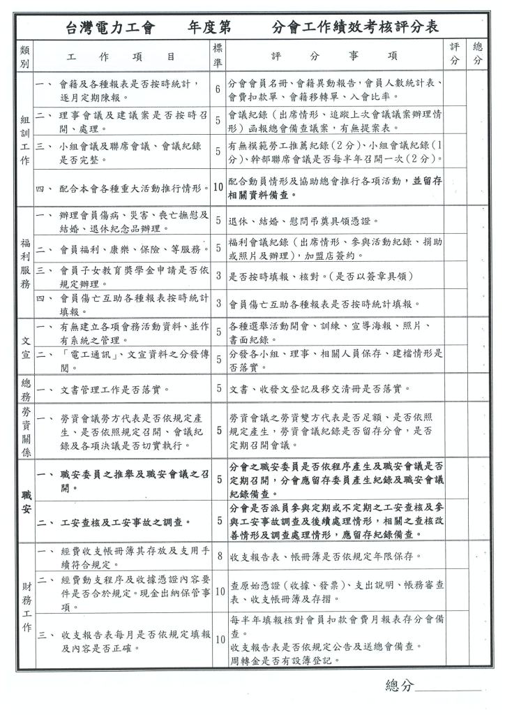 分會工作績效考核評分表 2025年 12月 2日 台灣電力工會 總務處 分會工作績效考核評分表 已關閉迴響。 年度考核評分表直式下載 分享此文: 分享至 LINE(在新視窗中開啟) LINE Tweet 以電子郵件將連結傳送給朋友(在新視窗中開啟) 電子郵件 相關