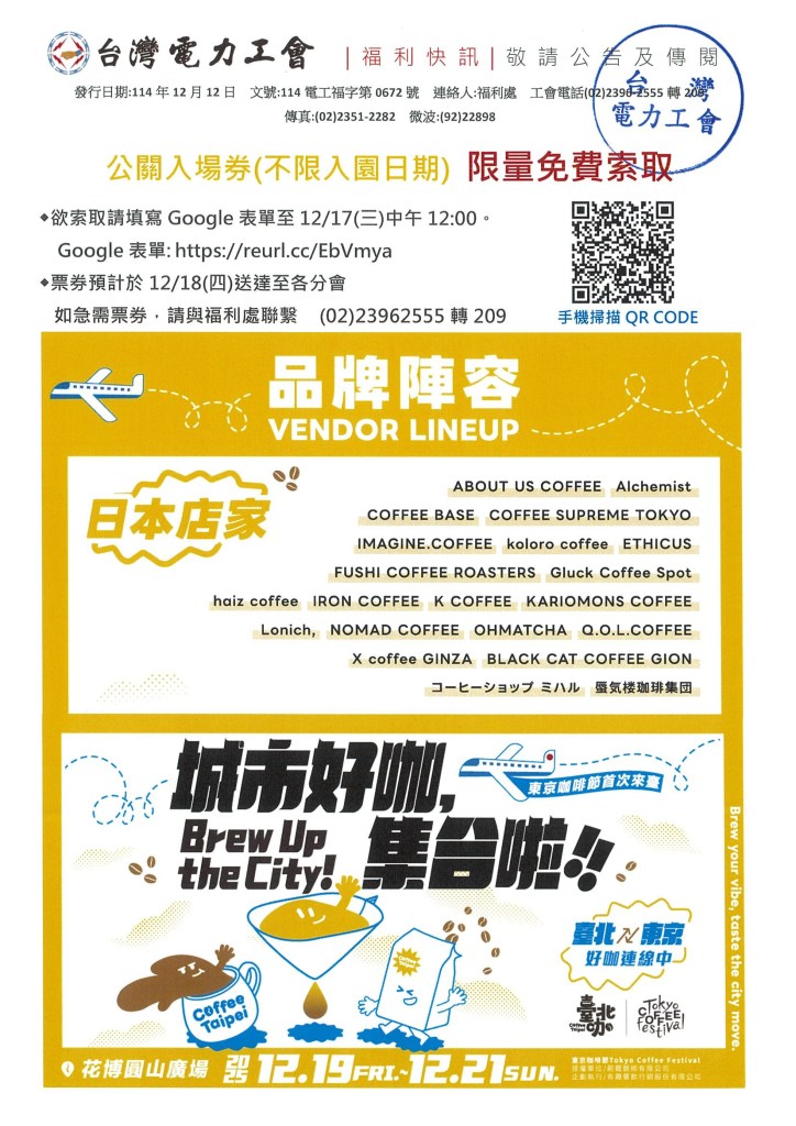2025臺北咖X東京咖啡節公關入場券限量免費索取 2025年 12月 18日 tplu 福利處, 福利專區 2025臺北咖X東京咖啡節公關入場券限量免費索取 已關閉迴響。 1141212福利快訊-2025臺北咖X東京咖啡節公關入場票優惠下載 分享此文: 分享至 LINE(在新視窗中開啟) LINE Tweet 以電子郵件將連結傳送給朋友(在新視窗中開啟) 電子郵件 相關