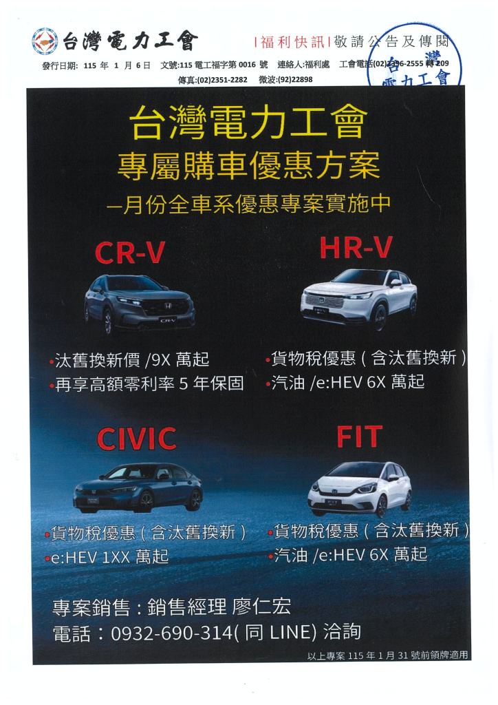 HONDA 台電員工購車優惠專案 2026年 01月 6日 tplu 福利處, 福利專區 HONDA 台電員工購車優惠專案 已關閉迴響。 1150106福利快訊-HONDA汽車優惠下載 分享此文: 分享至 LINE(在新視窗中開啟) LINE Tweet 以電子郵件將連結傳送給朋友(在新視窗中開啟) 電子郵件 相關