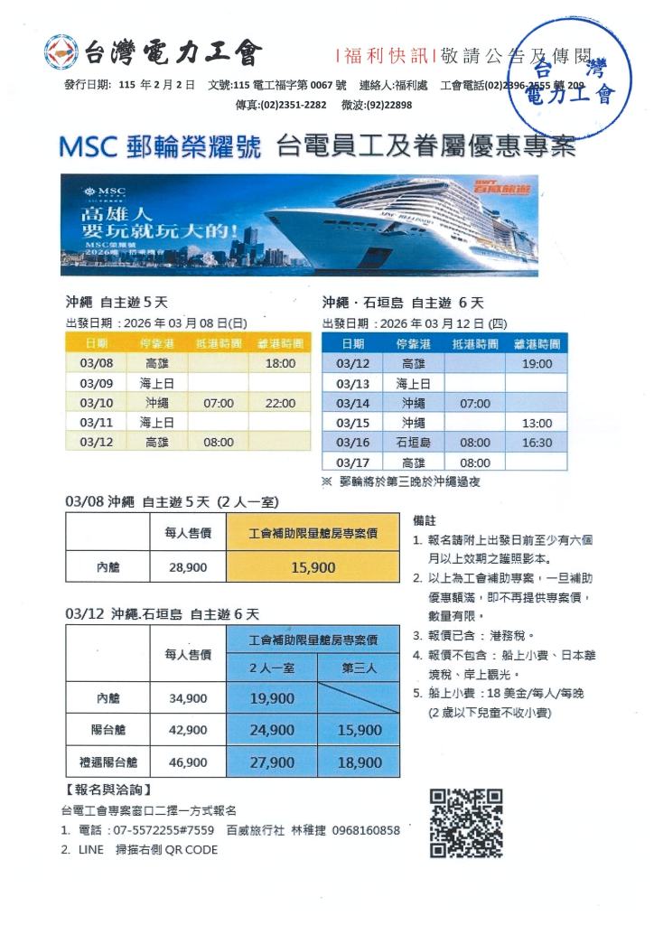 MSC郵輪榮耀號-優惠專案 2026年 02月 2日 tplu 福利處, 福利專區 MSC郵輪榮耀號-優惠專案 已關閉迴響。 1150202福利快訊-MSC郵輪榮耀號-優惠專案下載 分享此文: 分享至 LINE(在新視窗中開啟) LINE Tweet 以電子郵件將連結傳送給朋友(在新視窗中開啟) 電子郵件 相關