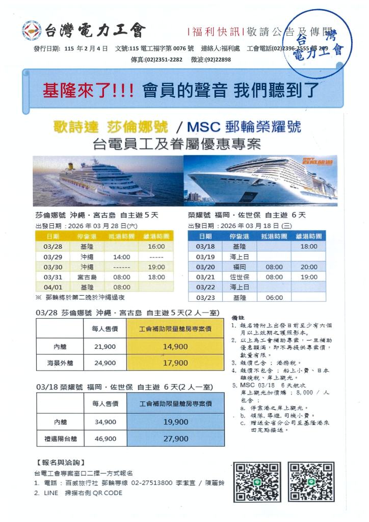 歌詩達莎倫娜號.MSC郵輪榮耀號-台電優惠專案 2026年 02月 4日 tplu 福利處, 福利專區 歌詩達莎倫娜號.MSC郵輪榮耀號-台電優惠專案 已關閉迴響。 1150204福利快訊-歌詩達莎倫娜號.MSC郵輪榮耀號下載 分享此文: 分享至 LINE(在新視窗中開啟) LINE Tweet 以電子郵件將連結傳送給朋友(在新視窗中開啟) 電子郵件 相關